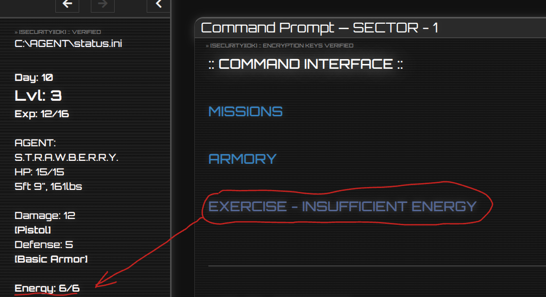 A few things I wanted to leave as feedback: the game is incredible, and the content, like the exercises, is fantastic. It would be good to have more exercises beyond strength and speed. That way, I think it would be easy to implement the other two stats that are currently underutilized. The only downside I have to the system is that there's no limit to how many exercises you can do, which makes it difficult to know when to stop. It would also be fantastic to unlock mini-blogs or terminal entries from the soldier's perspective to add some characterization.